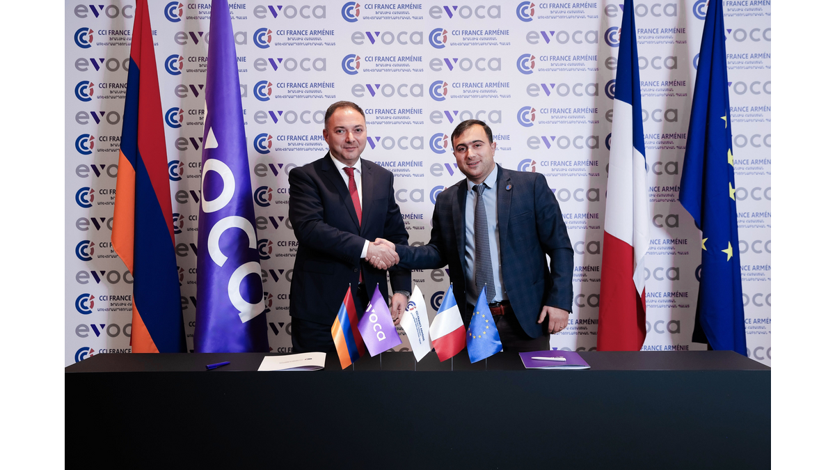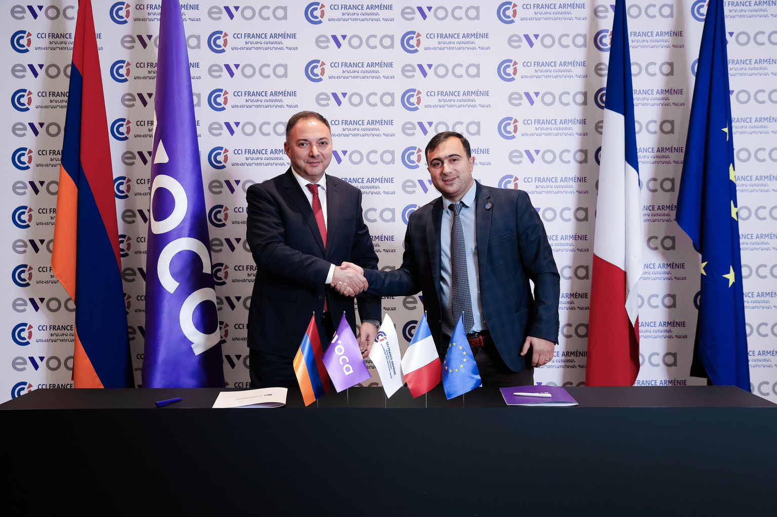 La Chambre de Commerce et d'Industrie France Arménie représentée par son Président Tigran Arakelian et Evocabank représentée par son CEO Karen Yeghiazaryan ont signé un mémorandum de coopération visant à stimuler les activités économiques des entreprises françaises en Arménie et à renforcer les relations commerciales entre les deux pays.